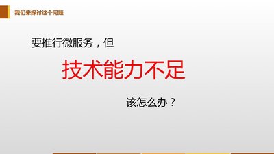 我先抛出一个问题:假设现在有一个公司,他要推微服务,但它确实之前没有这样的经验,它可能也缺乏这样的人才,所以在技术能力上它会有些欠缺。那这个时候怎么办?