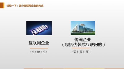 这个是我个人的玩笑,用于区分互联网企业的一个简单方式:当发现有些事情自己不会做,也没有合适的人手,没能力的时候怎么办?一般互联网公司的习惯都是:挖!没人是吧,看一下业界谁会,挖!挖不过来是吧,薪水乘 2?OK,互联网公司一般习惯这么干。但是传统企业一般不喜欢这么干,这里还包括伪装成互联网,大家应该懂这个意思吧?嗯,他的业务有可能是互联网业务,但他的工作方式,整个运作可能是传统企业的方式。但它的业务模式可能是互联网产品。这种企业的通常情况下它的习惯是买!拿钱去买,但他能买到什么?