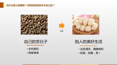 我们聊另外一个话题,可能更有意思:为什么大家想用微服务?尤其在参加技术大会之后。平时大家苦日子过习惯了,后来某人参加了某个技术大会之后,回来就觉得:平时这苦日子过得有点惨。旁边的这个是麦粒,不知道大家有没有吃过?晒干之后脱皮直接煮着可以吃的,甚至也可以生吃。然后是非常难吃的,很难下咽,但古代,我们的祖先原来就是这么吃下来的。后来发现参加了一场大会之后,发现这个受不了,为什么呢?发现别人吃的是右边的东西。