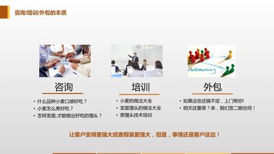 外包是什么?就是这些东西,做咨询了,给方案了,也做了一些培训了,但是还是搞不定。可能技术不够,也可能人力不足。那怎么办?上门帮你。对吧?我直接帮你蒸一屉馒头,客户就会问了:今天搞定了,明天怎么办,是吧?这个问题肯定是现成的,今年的这个目标搞定了,但是馒头明天还是想吃,不想明天再搞回去的,是吧?OK,好开心的告诉客户,二期合同,签二期合同,轻松帮你搞定。