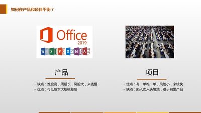 产品是个什么概念?大家最熟悉的,左边这个图,office 系列,或者说它背后的 windows 操作系统。差不多是过去十几年,软件行业我感觉应该是最成功的所谓”产品”。产品的概念:难度非常大。你看 windows、office 出了这么多年,有谁超过了?然后它的周期非常长,开发一个产品,好几年。几千个人,甚至更多的人堆在上面。它的风险非常大,一次投资就是几亿几十亿。然后来钱其实挺慢的,因为他要慢慢铺开。这个产品铺上去可能几年之后陆陆续续回本。但是,有个极大的优点:非常低成本的大规模复制。Office 2019,它的第一份拷贝成本可能高到几十亿美元,但它的第二份拷贝的成本是多少?第两千份拷贝的成本是多少?第 1000 万份,它的成本又是多少?
