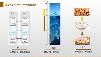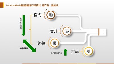 将整个模式牵回到一个正统的重产品重技术的途径,也就是说,我们会通过提供更好的产品,然后这个产品可以更多的更普遍地满足客户的需求,从而降低客户的门槛。当客户入门的门槛降低的时候,他对于咨询、培训、外包的需求就会降低。那他会有更多的资金预算投到产品的采购当中,这样会让提供产品的技术公司有更多的利润,然后继续加强产品,形成这样一个良性的循环。这是 Service Mesh 在整个微服务市场当中非常非常重要的一环,必须要让原来的恶性循环的场景开始向现在这样一个良性循环做转变。