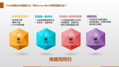 然后可以帮助 PaaS 平台更好的去整合资源,因为 PaaS 天生是提供各种能力的。这些能力,原来是以单个单个的方式提供给客户,大家如果有注意到的话,所有 PaaS 平台都卖各种产品各种能力,然后可以自己选择去用。Mesh 有个好处是说它本身就可以天然地把这些能力组合起来,变成一个统一的全套方案,直接覆盖监控、告警、故障排查,变成整个基础能力的一部分,变成 PaaS 平台的一部分,通过这样的方式来发挥 PaaS 平台的威力。