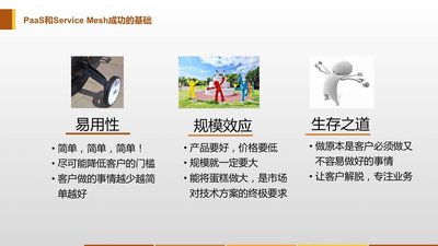 整个 PaaS 和 Service Mesh 的生存之道(大家如果有留意到,我们一路下来这个脉络)是说它做了一个重要的事情,就是它实际上是在帮客户做事情:这些事情是客户必须要做的,但是他又不太容易做好。我们的生存之道是帮助客户从这些细节里面解脱出来。客户大多数情况下是业务驱动的,我们要做的就是把所有的他要做又不好做的这些事情都下沉下来,我们帮他做好。