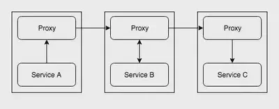好,让我们来搭建一个由 3 个服务组成的“Service Mesh”。我们要搭建的“Service Mesh”的结构如下所示,每个服务旁都设置有一个代理。