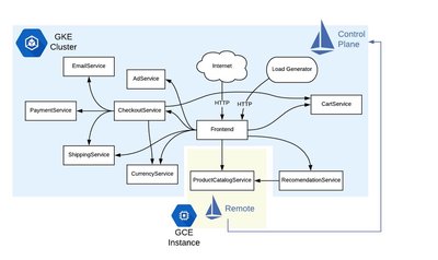 该 GCE 虚拟机运行一组最小的 Istio 组件,以便能够与中心的 Istio 控制平面通信。然后,我们将 Istio ServiceEntry 对象部署到 GKE 集群,该集群在逻辑上将外部 ProductCatalog 服务添加到网格中。