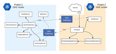 关于这种单一控制平面方法的令人兴奋的事情是,我们不必改变任何有关我们的微服务如何相互通信的信息。例如,前端仍然可以使用本地 Kubernetes DNS 名称(cartservice:port)调用 CartService。此 DNS 解析有效,因为同一 GCP 项目中的 GKE pod 属于同一虚拟网络,因此允许跨群集进行直接的 pod-to-pod 通信。
