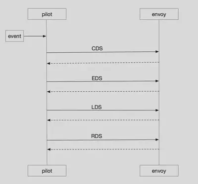 Istio 中的流量管理策略是通过 Pilot 统一管理下发给 Envoy 的,Envoy 作为数据面,对外提供 XDS 接口。为了保证最终一致性,Pilot 实现了 Envoy 提供的 ADS(Aggregated Discovery Service) 接口,执行顺序为:CDS, EDS, LDS, RDS。Pilot 本身是无状态的,所有的资源配置全部以 CRD 实例的形式保存在 Kubernetes 集群上,Envoy 和 Pilot 连接建立完成以后,Pilot 以事件通知的形式触发推送,Envoy 配置更新生效。