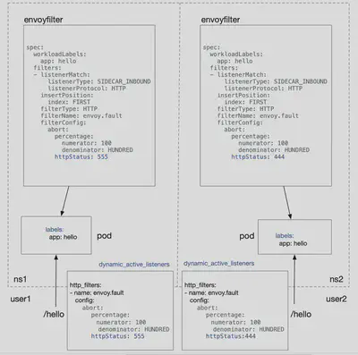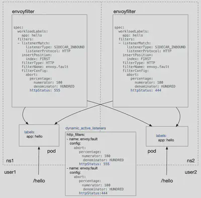 如果图中的两个用户 user1 和 user2,分别在对应的 namespace 下面部署两个具有相同标签的 pod,绑定不同的 EnvoyFilter,返回码应该分别为 555(user1)和 444(user2)。但 user2 访问/hello 得到的最终返回码是 555,与预期 444 不符,其行为被 user1 干扰了。 原因就在于缺少 namespace 级别的隔离。