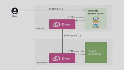 - 从 Traefik Ingress 出来的请求被重定向到 Istio sidecar(由 iptables)。