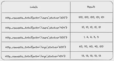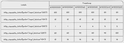 在我们的示例表中,我们有带有path和status标签的计数器http_requests_total。对于每个path和status的组合,我们为每个时间戳存储一个计数器值。