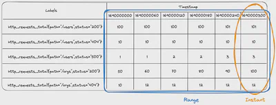 下面是即时向量和范围向量之间的区别的示例。即时向量以橙色显示,是一个时间点上的值的快照。范围向量以蓝色显示,每个系列的每个时间点都有一个值。