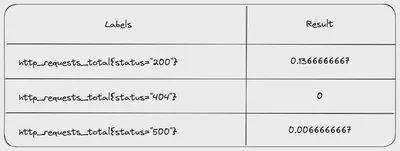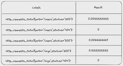 如果我们将以下查询发送到 Prometheus,我们将获得以下即时向量。请注意,它只是上面表格中的最后一列数据。