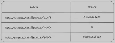 如果我们将以下查询发送到 Prometheus,我们将获得以下即时向量。请注意,它只是上面表格中的最后一列数据。