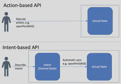架构上的关键区别在于,基于意图的 系统既能理解系统当前所处的状态(有时称为 实际状态 ),也能理解你对系统应该处于何种状态的意图(期望状态)。系统不断地计算两者之间的差距,并采取任何必要的行动使实际状态变成期望状态。用户可以直接通过 API 调用来改变期望状态,而依靠系统本身来改变实际状态。