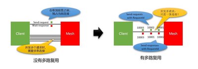 HTTP/1.1不支持多路复用(http1.1有提过支持幂等方法的pipeline机制但是未能普及),用的是经典的ping-pong模式:在请求发送之后,必须独占当前连接,等待服务器端给出这个请求的应答,然后才能释放连接。因此HTTP/1.1下,并发多个请求就必须采用多连接,为了提升性能通常会使用长连接+连接池的设计。而如果有了requestid和多路复用的支持,客户端和Mesh之间理论上就可以只用一条连接(实践中可能会选择建立多条)来支持并发请求: